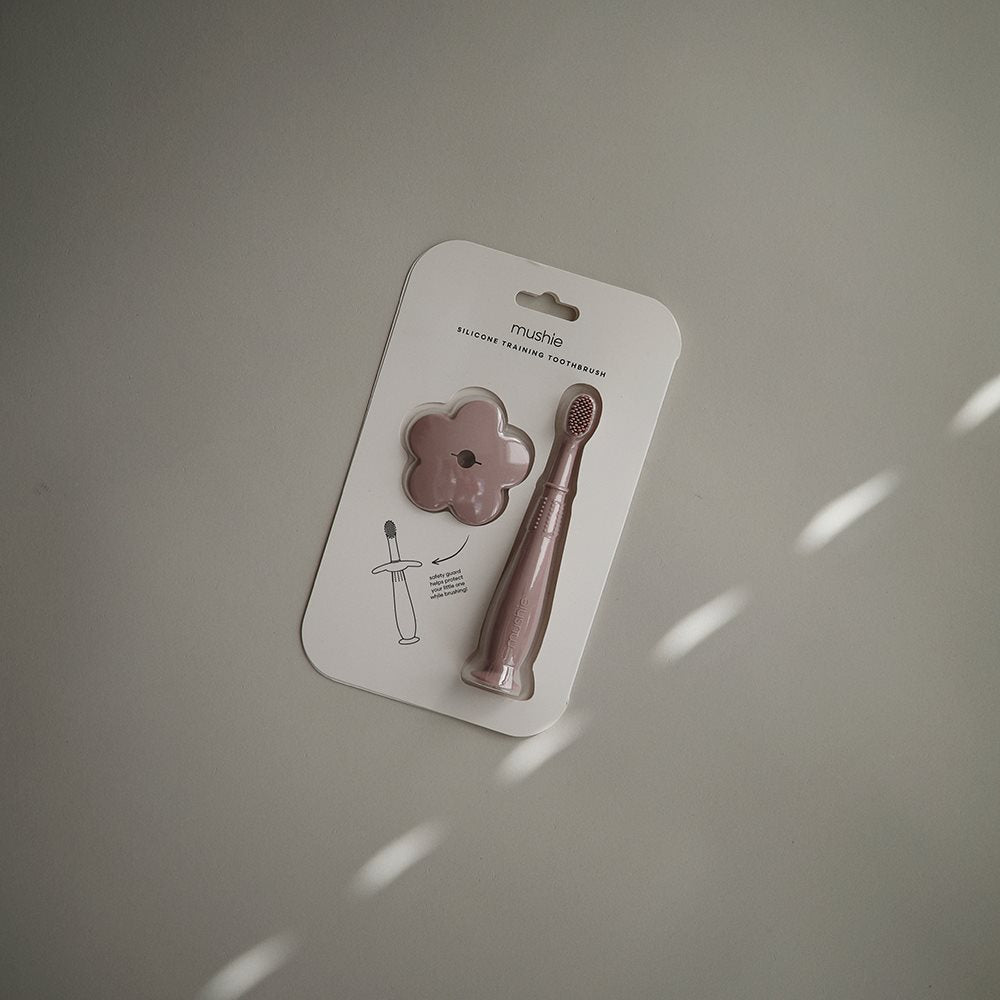 Mushie Baby Toothbrush er udstyret med bløde børstehår, der renser og masserer tænder og tandkød.