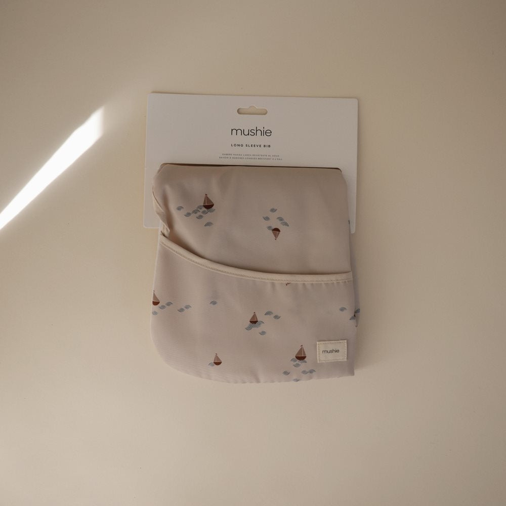 Mushie-smækken med ærmer har et smukt bådmotiv, der er perfekt til den lille sømand.