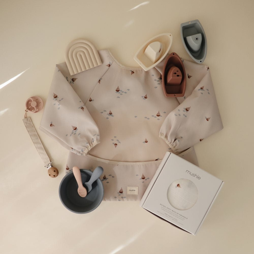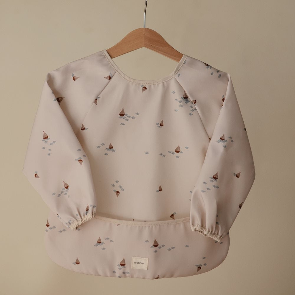 Mushie-hagesmækken med ærmer er nem at tage på, rengøre og genbruge.
