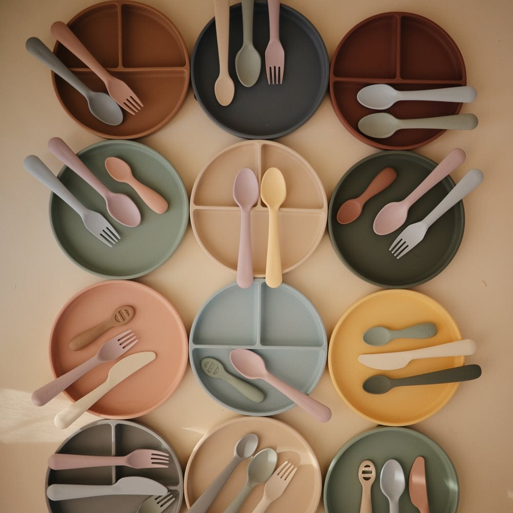Silikoneplade med sugekop Shifting Sand Mushie designet til babyens første selvstændige måltider.