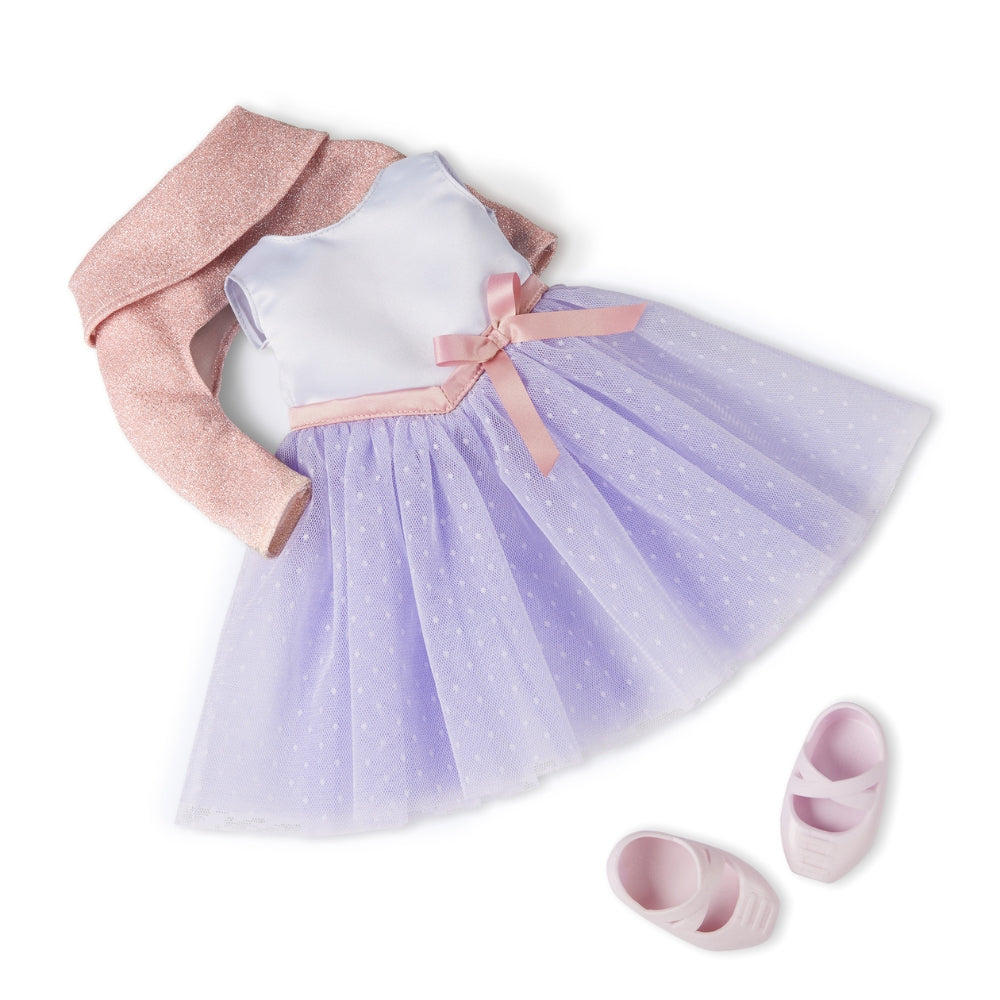 Sættet indeholder også en glitrende bolero og klassiske balletflade sko, der fuldender stilen.