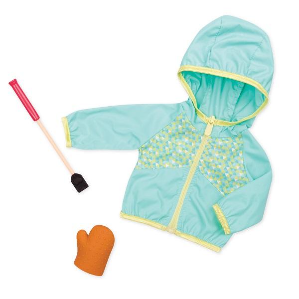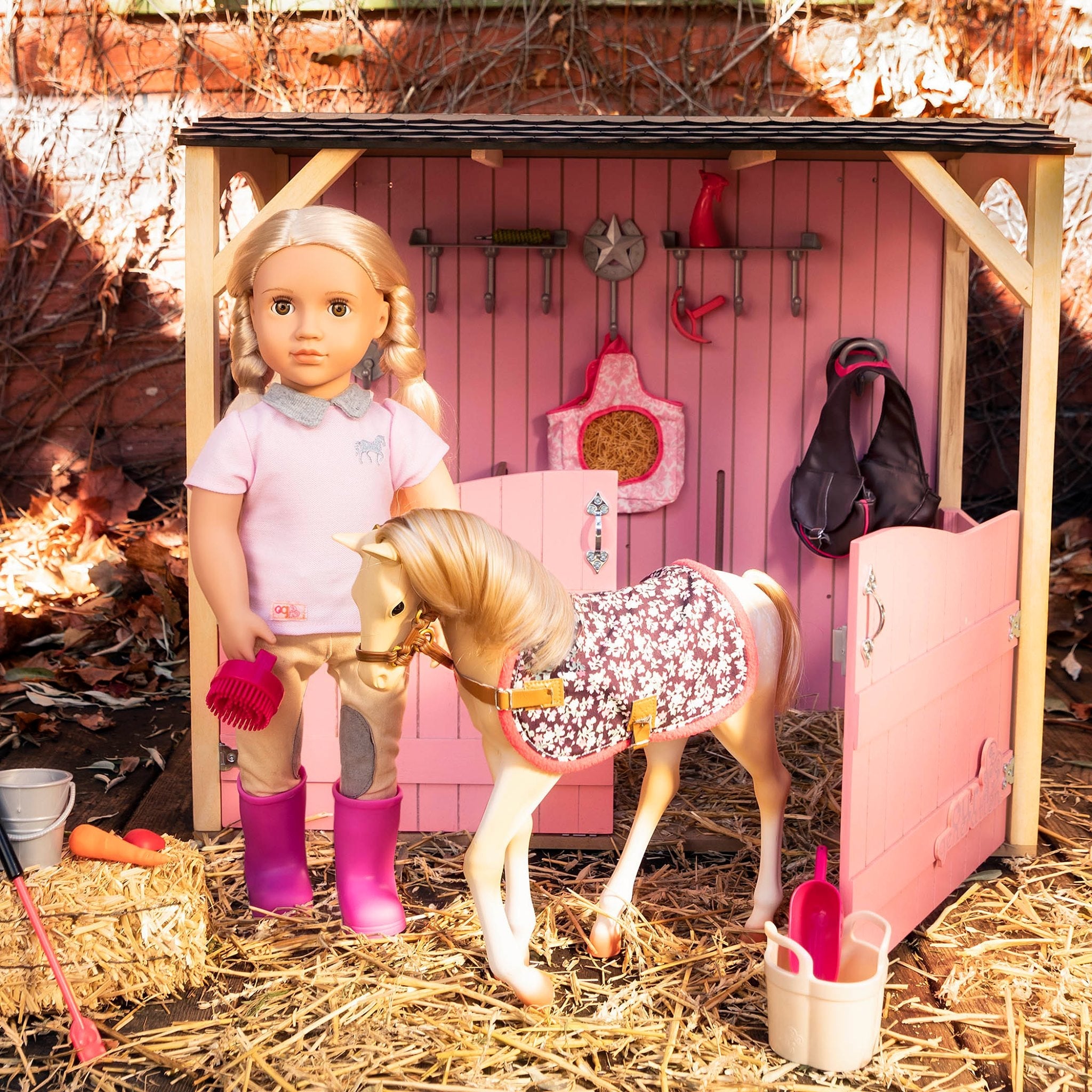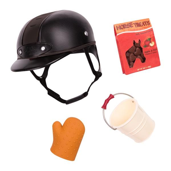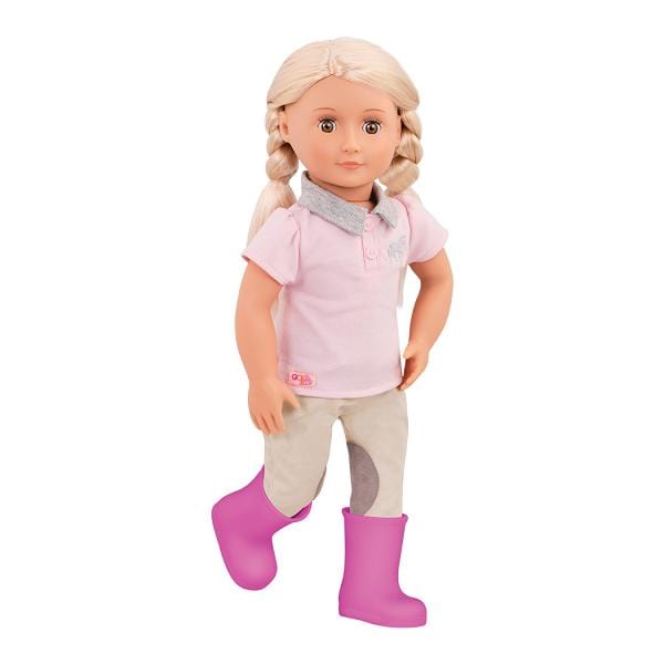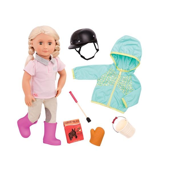 - Sættet indeholder: 46 cm dukke, lyserød polo, beige ridebukser, undertøj, lyserøde gummistøvler, sort hue, regnjakke, hestekam, spids, spand, pose med snacks til hesten.