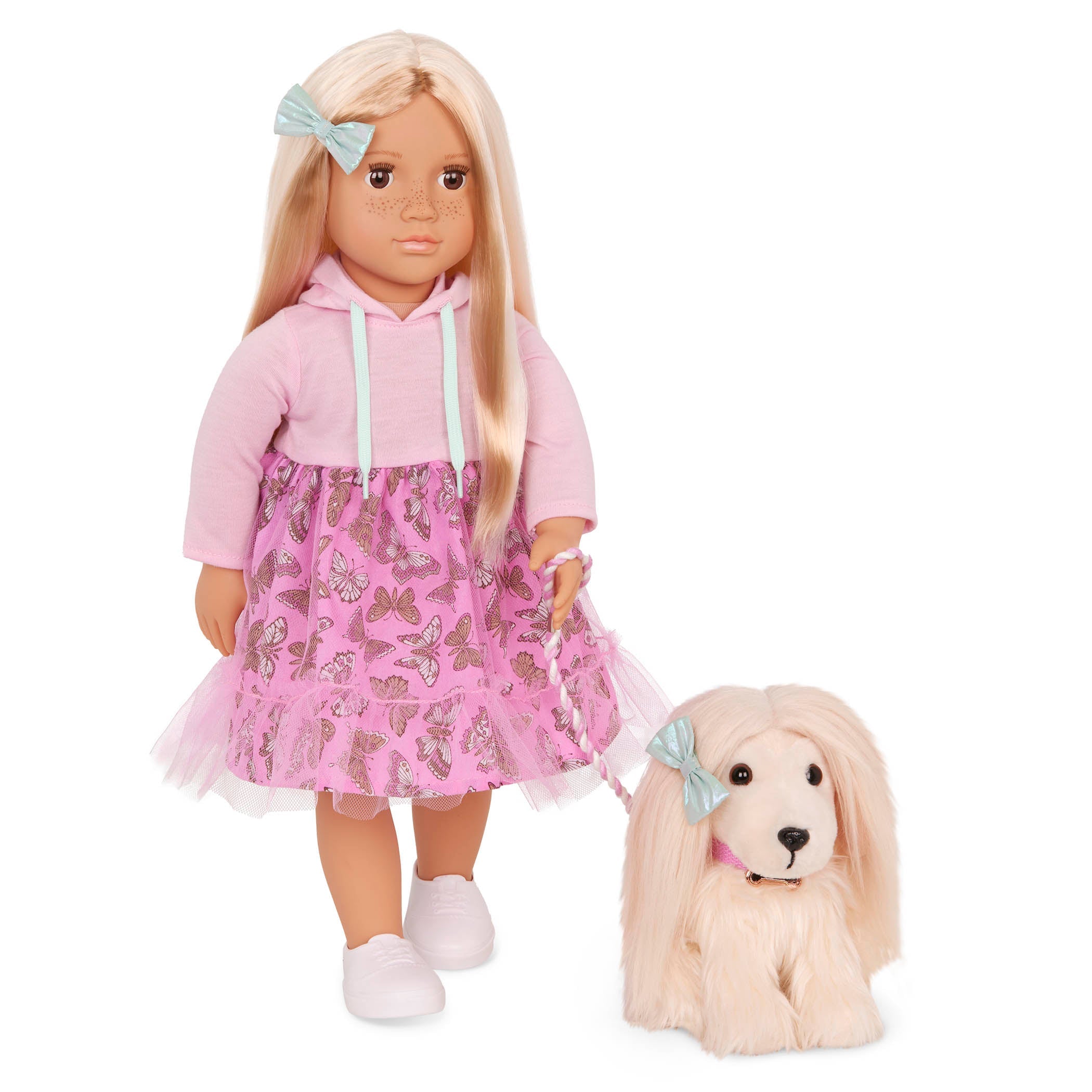 Moderne Hattie-børnedukke med hund og tilbehør, 46 cm høj, fra Our Generation.