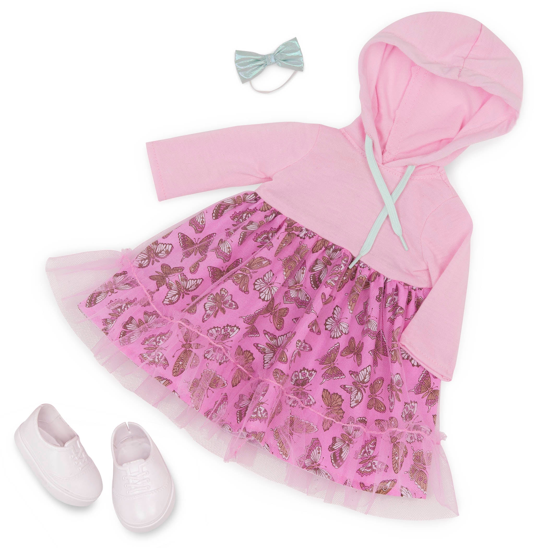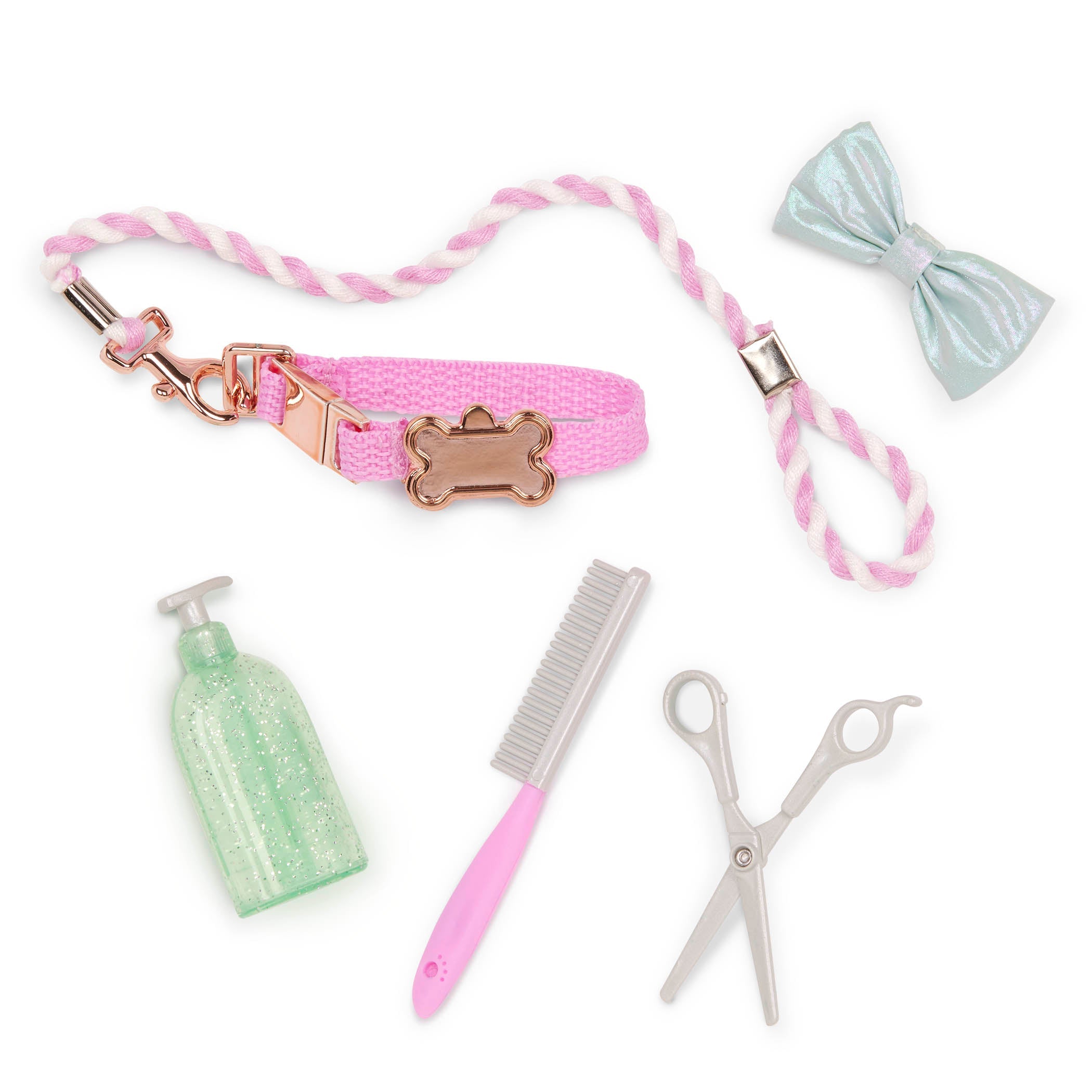 - Inkluderet: dukke, lyserød kjole med hætte, undertøj, hvide sko, skinnende sløjfe, hårspænde, hund, halsbånd, snor, shampooflaske, saks, kam, hårelastik med skinnende sløjfe