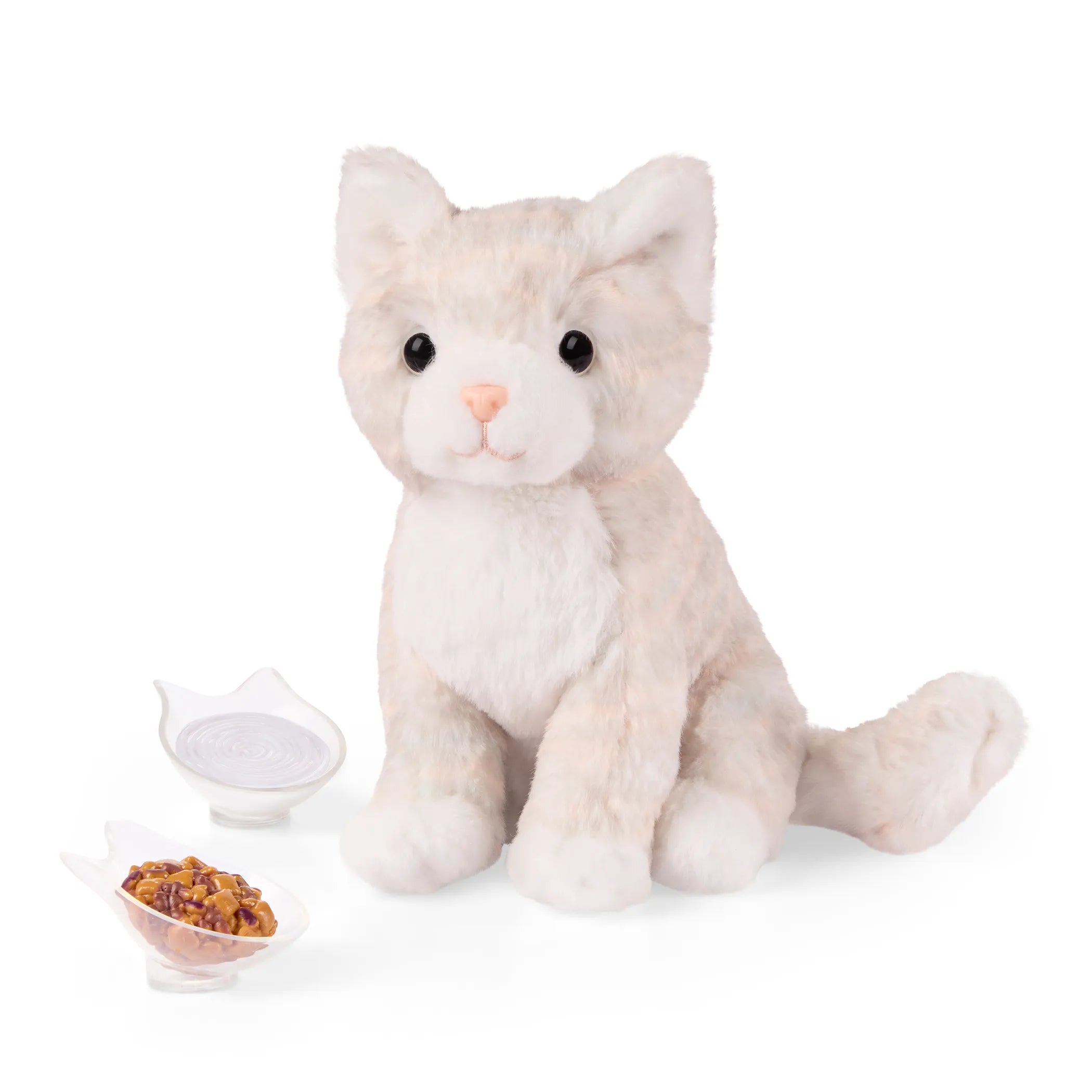 - Inkluderet: plys kat, hule med legetøjsmus, kradsetræ, lyserødt kuppelhus, fodringshylde, mælkeskål, madskål, dåse sardiner, pose med godbidder, børste, bold