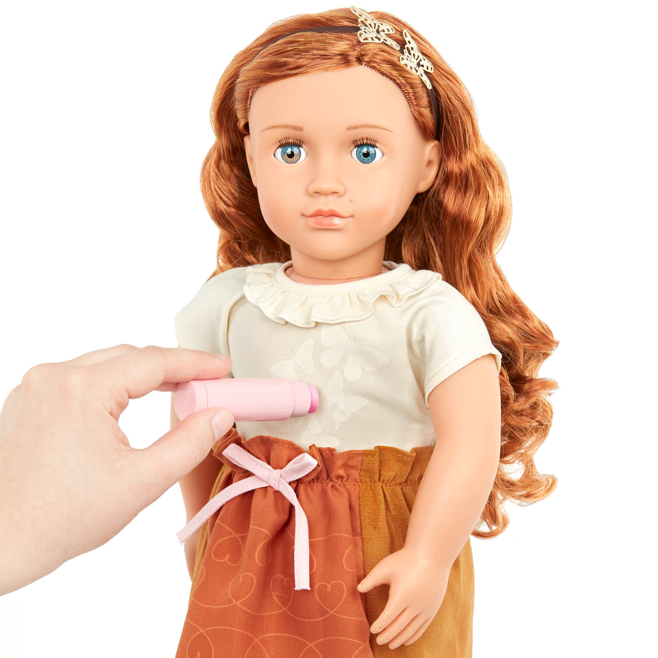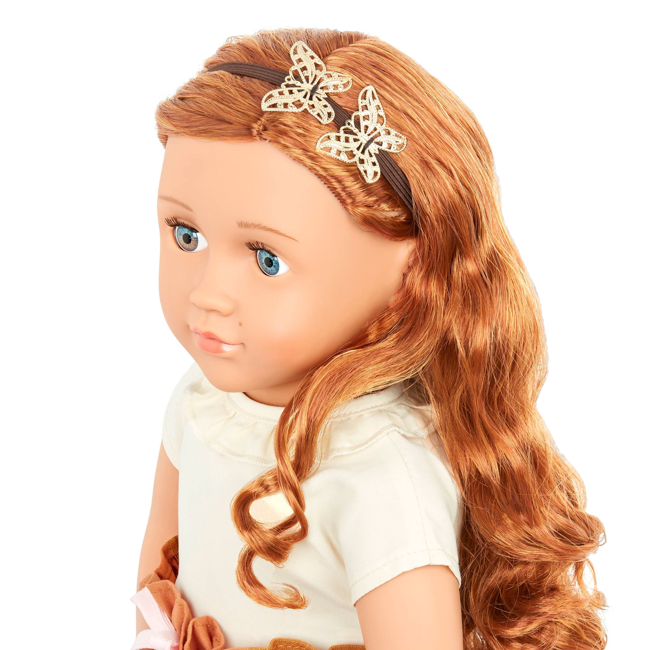 En moderigtig 46 cm høj Nova-børnedukke med sommerfuglemotiv og skjulte mønstre på tøjet fra Our Generation, perfekt til sjov med hårstyling.