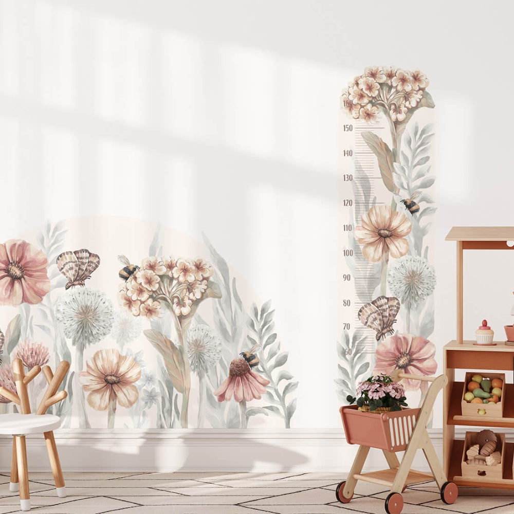 Vægklistermærker til børns vækstmåler med markblomster er et klistermærke dekoreret med akvarelblomster, sommerfugle og bier.