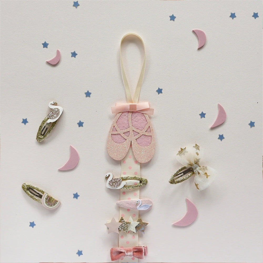 Rockahula-hængeren er dekoreret med yndige ballerinaer i blødt lyserødt glitter, en smuk sløjfe og et hjerte i bunden.