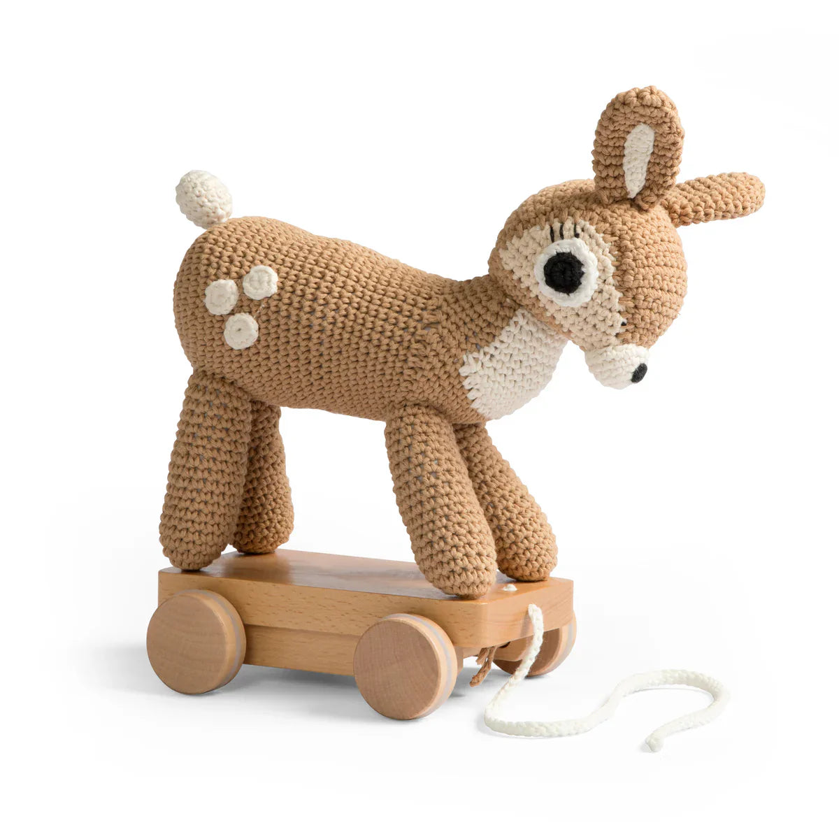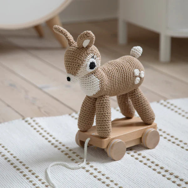 Det håndhæklede Dixi Deer træklegetøj er lavet af bomuld og fyldt med genanvendt polyester.