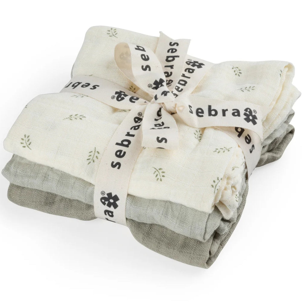 Sættet indeholder tre bleer lavet af økologisk muslinbomuld: to i ensfarvede, dæmpede farver og en dekoreret med det delikate Powder Blossom-mønster, der er karakteristisk for Sebra-mærket.