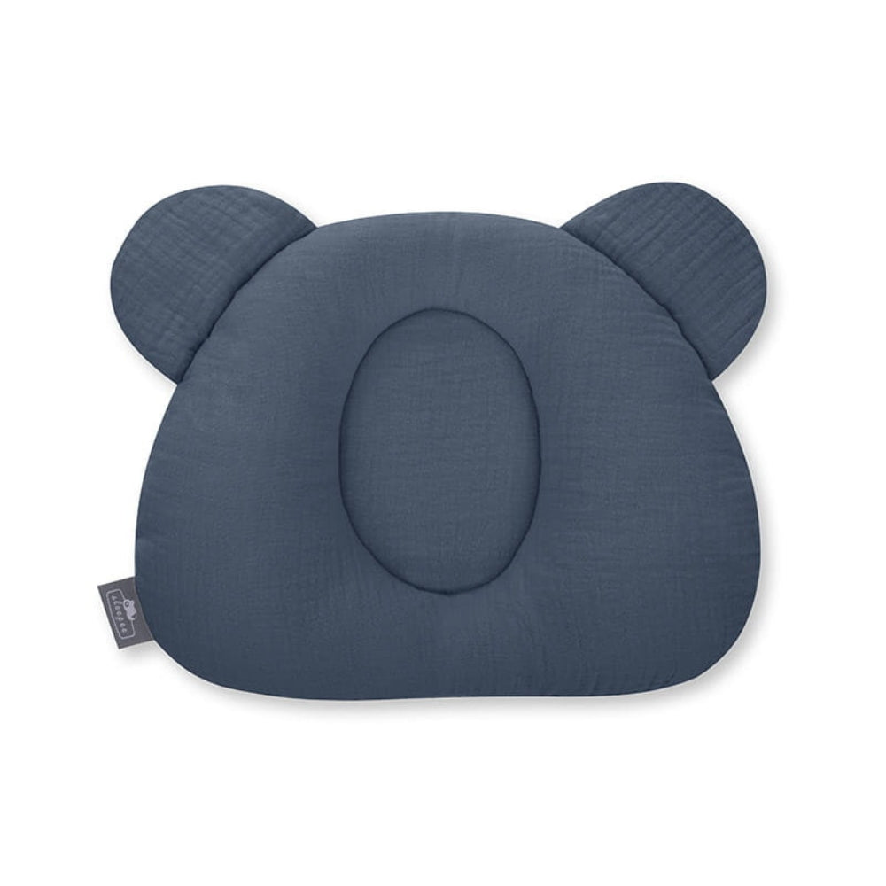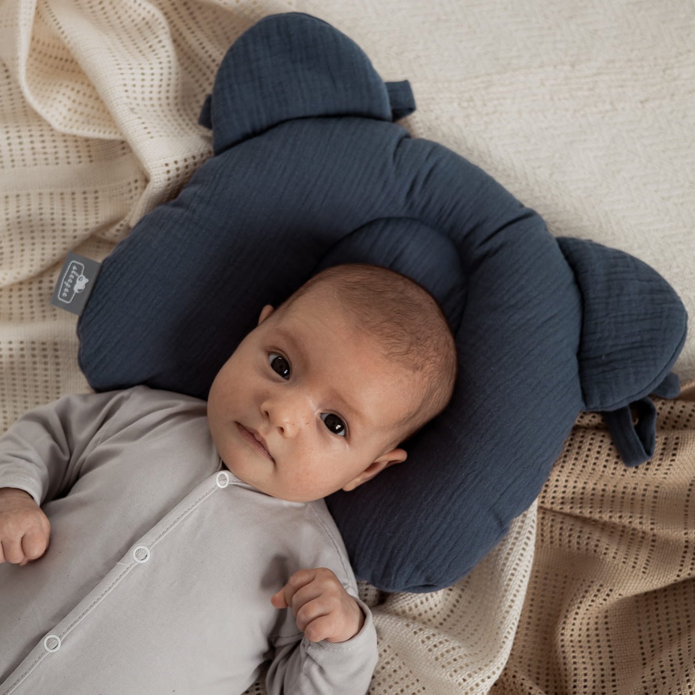 Sleepee-babypuden er lavet af blødt bomuldsmuslin og er formet, så den ligner et bamsehoved.