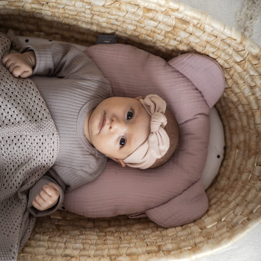 Sleepee-babynpuden er lavet af blødt bomuldsmuslin og har form som et bamsehoved.