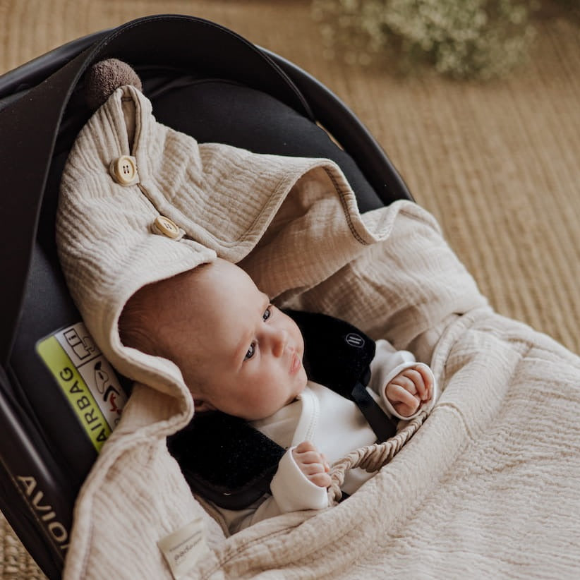 Sleepee Summer Muslin Wrap til autostol, grå i sandfarve.