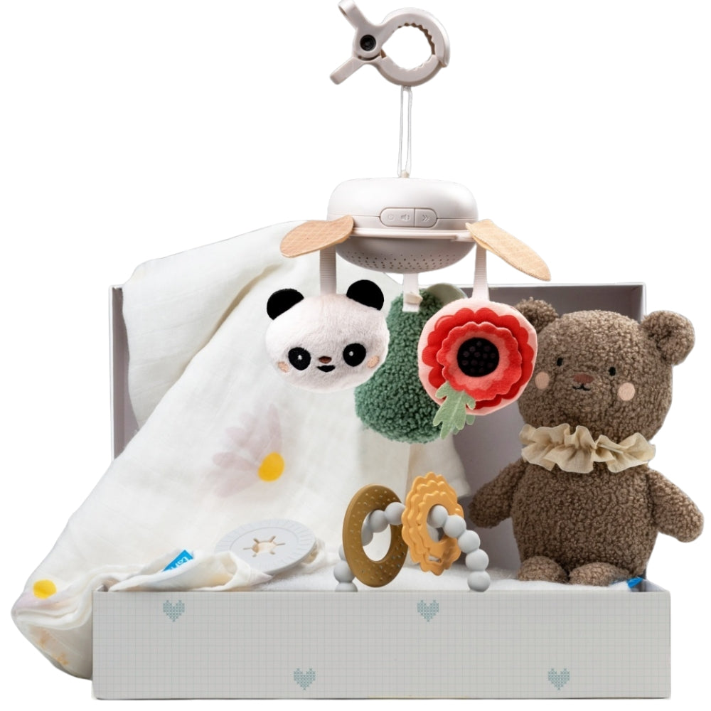 Den elegante æske indeholder et omhyggeligt sammensat sæt, der understøtter babyens udvikling fra de første dage af livet.