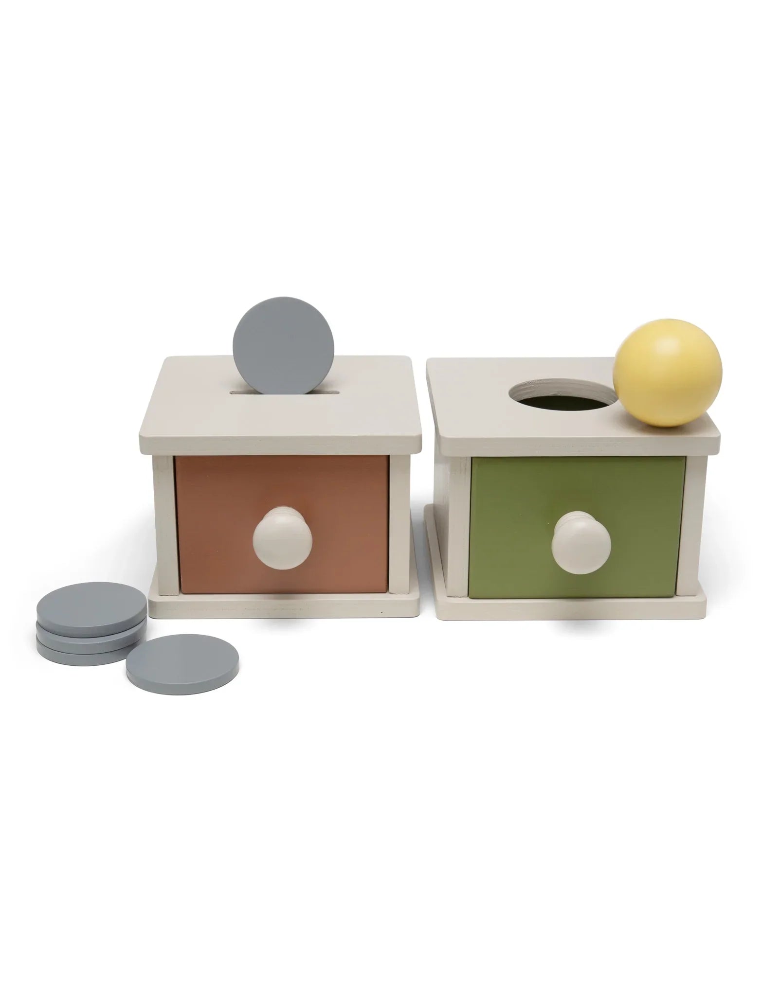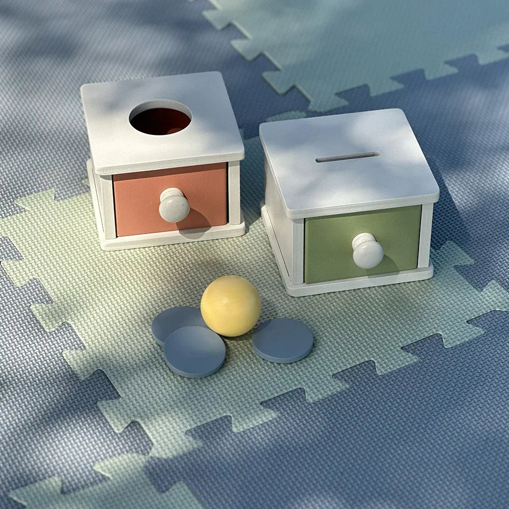 Den ene sorteringsboks indeholder en rund kugle, som babyen kan smide ned gennem hullet og derefter åbne skuffen for at tage den ud og gentage legen.