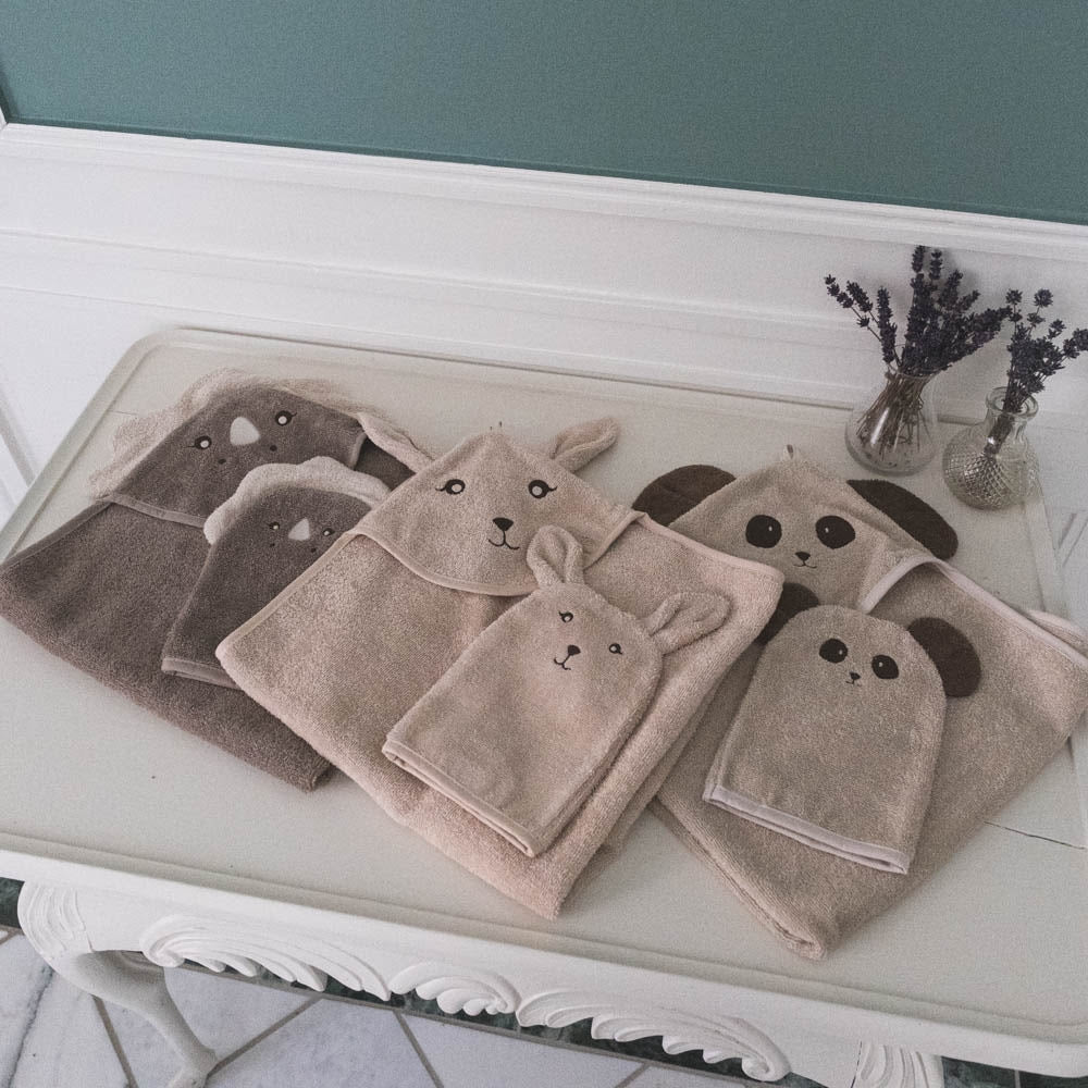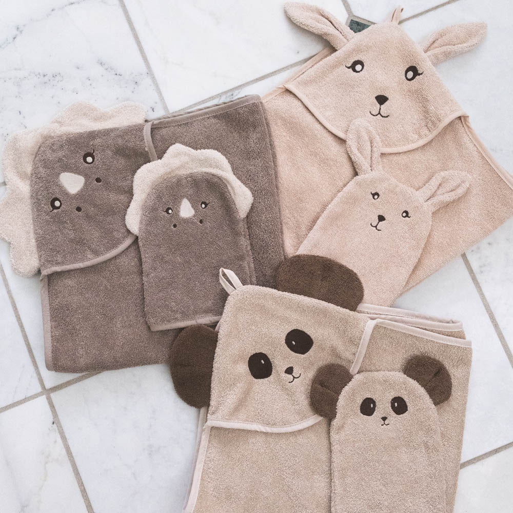 De er fremstillet af 100 % økologisk frottébomuld, som er blødt mod babyens hud, og takket være dyremotiverne med store ører bliver vask til en sjov leg.