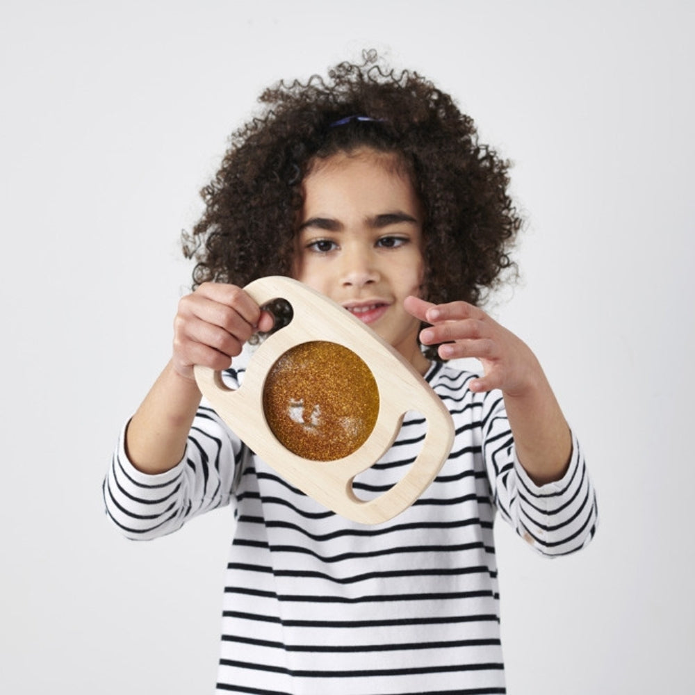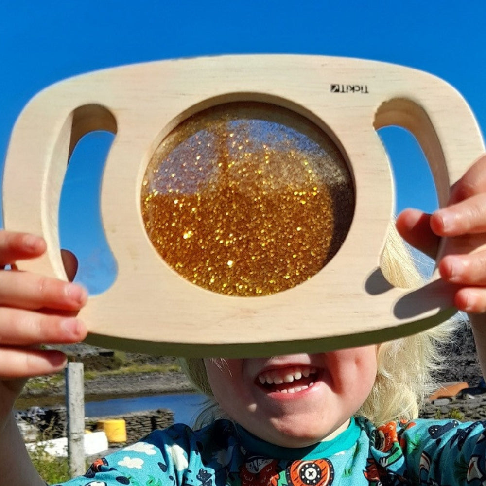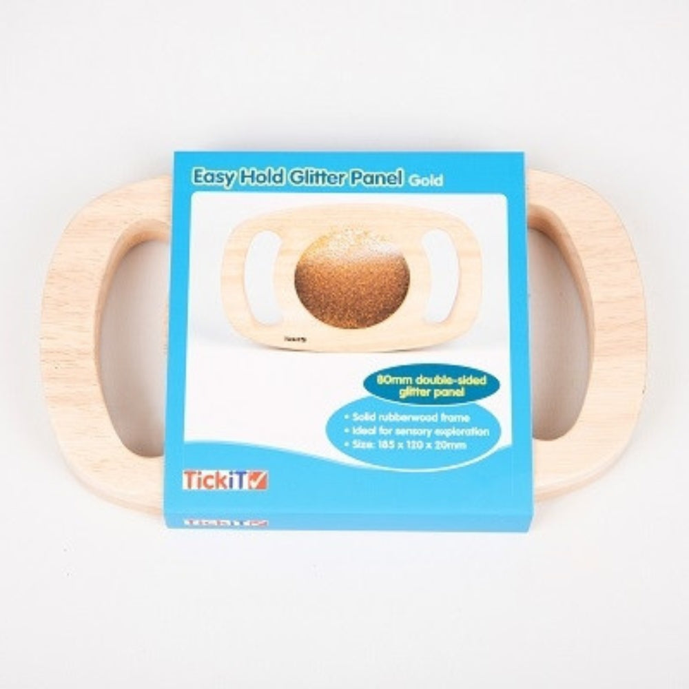 Sensorisk legetøj med guldglitterpanel fra TickiT, der er let at holde på.