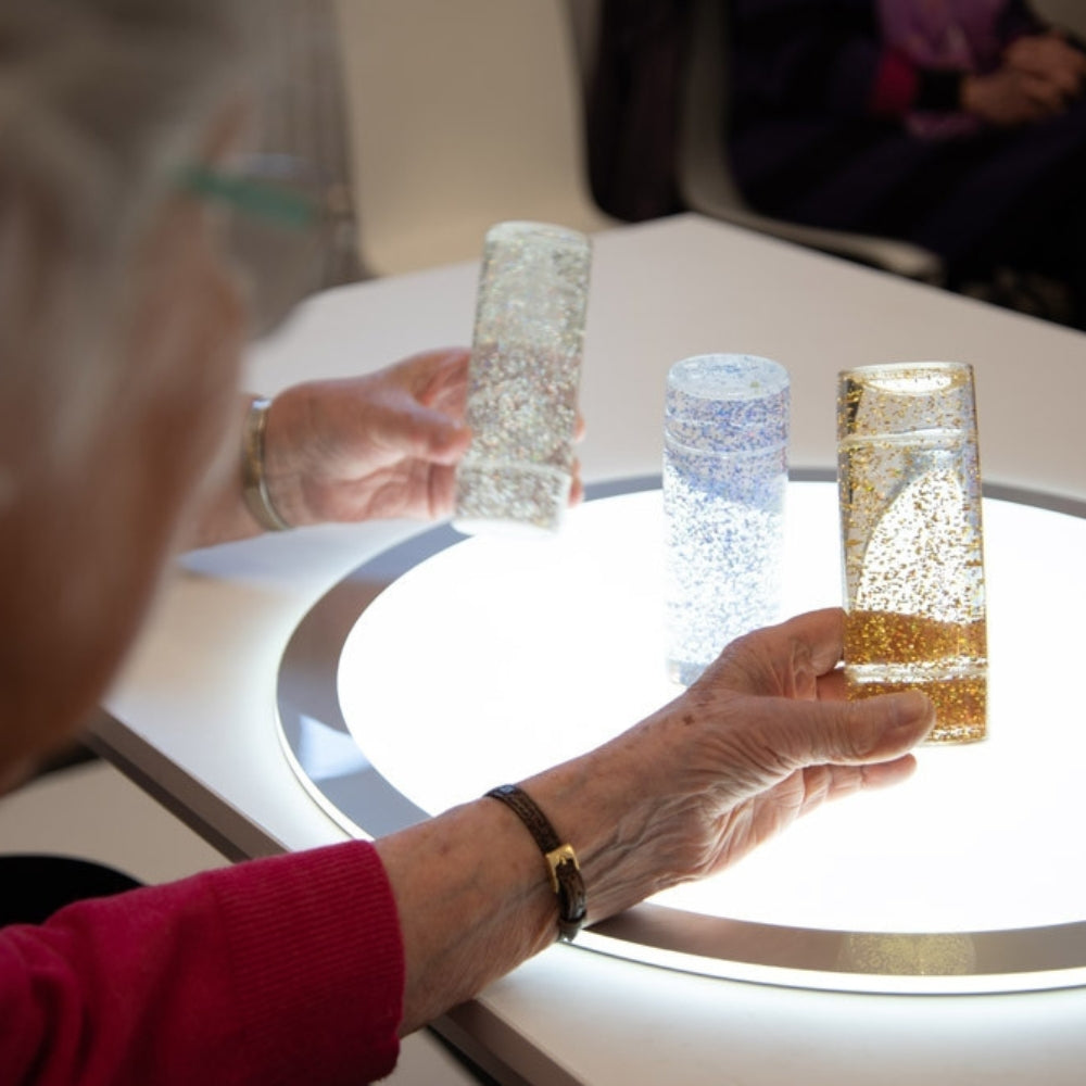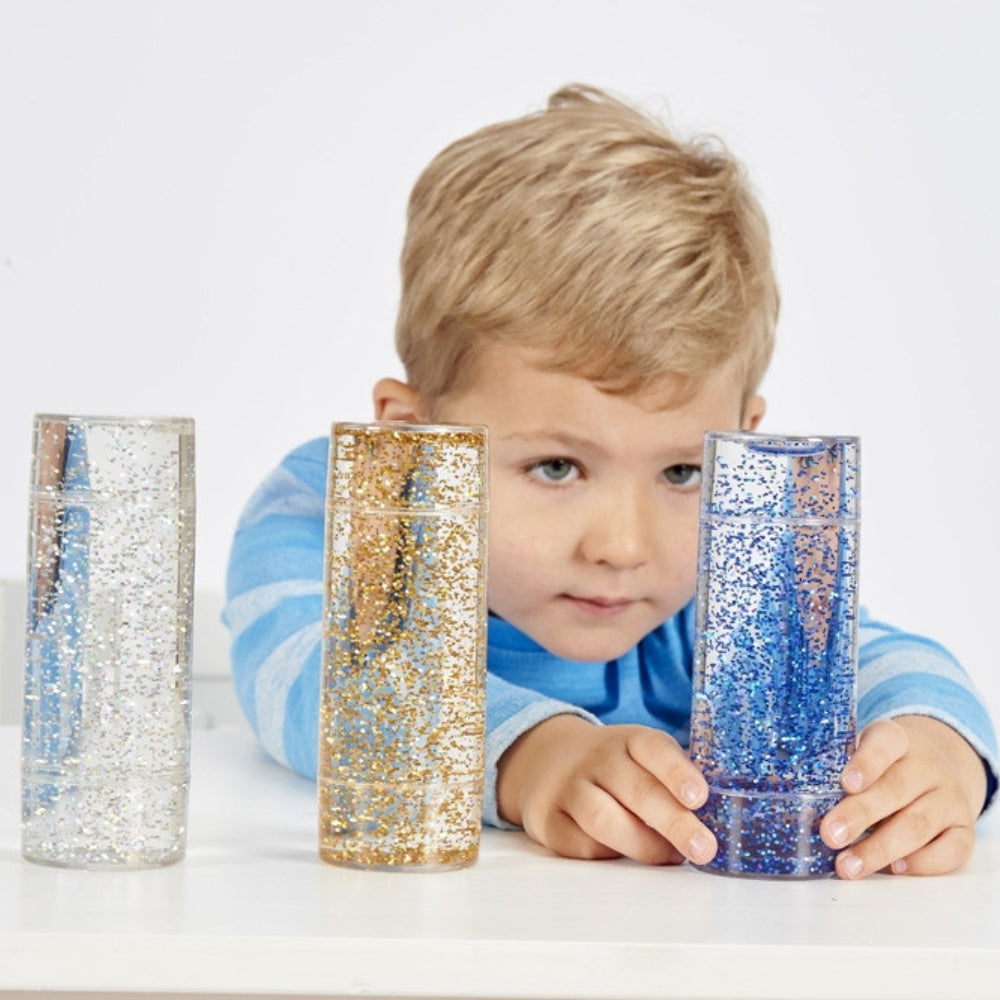 Når cylindrene vendes på hovedet eller rystes, dannes der en hvirvlende glitterstorm indeni, som derefter aftager og skaber en fængslende og fascinerende kilde til ro og fokus.